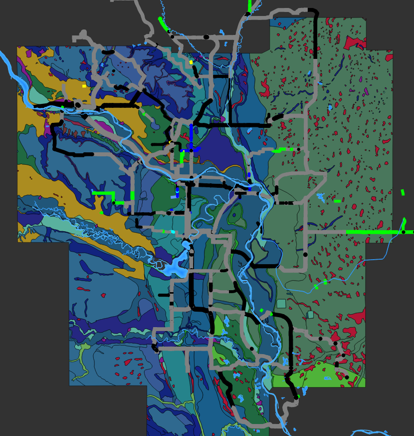 I coloured the GIS soil layer so that the larger the particle size, from clay to silt to sand to gravel, the cooler a colour. Very general rule, the larger the particles, the less corrosive. And extra-corrosive soils, the pond sediments, I made red hot.